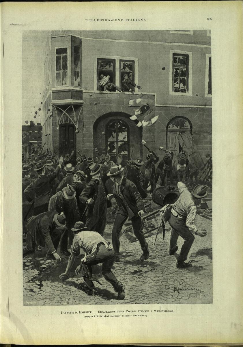Bereits in den Morgenstunden des 4. November zogen etwa 800 Personen durch die Stadt und wütete gegen italienische Geschäfte und Einrichtungen. Rasch kam die italienische Rechtsfakultät ins Visier des Mobs, deren Eröffnung am Tag zuvor Auslöser der Unruhen gewesen war. Mit Steinen warfen die Demonstranten sämtliche Fenster des Fakultätsgebäudes ein, sie zogen aber weiter, als die städtische Sicherheitswache herannahte. Am frühen Nachmittag – nachdem in der Zwischenzeit italienische Gasthäuser und Händler überfallen worden waren – gab es neuerlich einen Menschenauflauf vor der Fakultät. Nun verschafften sich die Demonstranten mit Spitzhacken Zugang zum Gebäude, traten Türen und Fenster ein, schlugen das Mobiliar kurz und klein, stießen sogar die Öfen um. Die Trümmer warfen sie auf die Straße. Schaulustige feuerten die rasende Menge an.